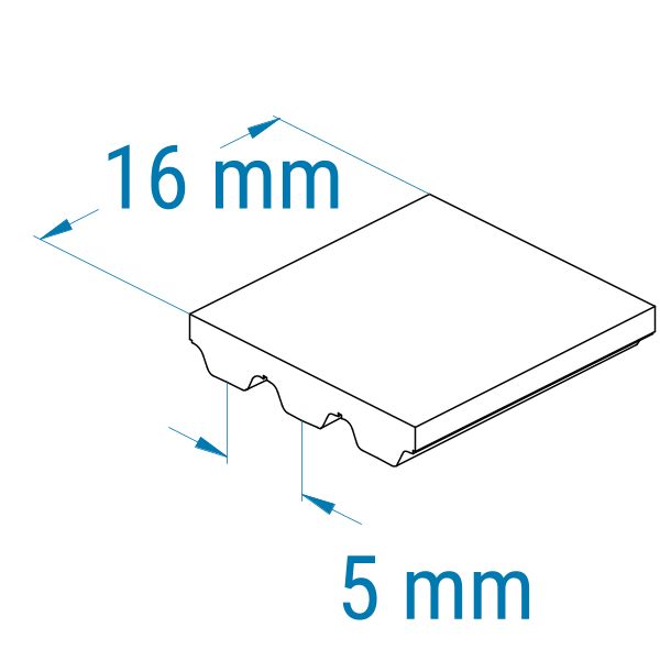 Das AT5-Profil ist trapezförmig. Der Zahn ist bei diesen Riemen wesentlich größer als die Zahnlücke. Aus diesem Grund können sie nicht so klein umgelenkt werden wie Riemen mit einem T-Profil. Der Abstand von Zahnmitte zu Zahnmitte beträgt bei dem AT5-Profil 5 mm.