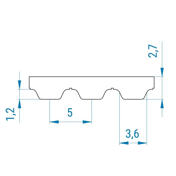 Das AT5-Profil ist trapezförmig. Der Zahn ist bei diesen Riemen wesentlich größer als die Zahnlücke. Aus diesem Grund können sie nicht so klein umgelenkt werden wie Riemen mit einem T-Profil. Der Abstand von Zahnmitte zu Zahnmitte beträgt bei dem AT5-Profil 5 mm.