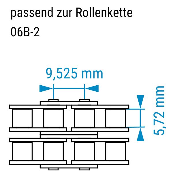 Teilung 9,525 mm von Bolzen zu Bolzen und Rollenbreite 5,72 mm.