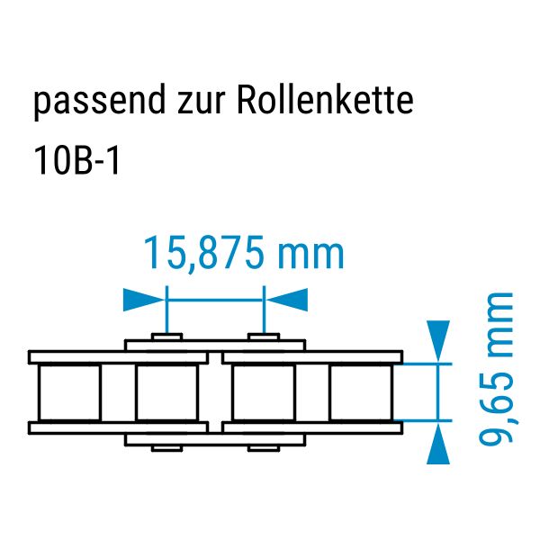 Teilung 15,875 mm von Bolzen zu Bolzen und Rollenbreite 9,65 mm.