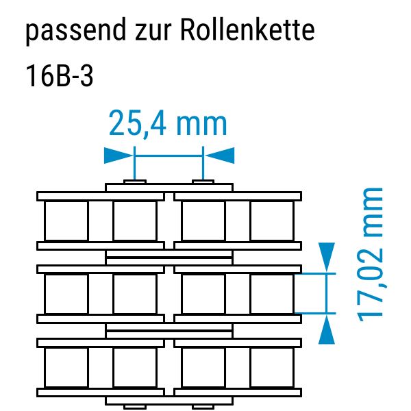 Teilung 25,4 mm von Bolzen zu Bolzen und Rollenbreite 17,02 mm.