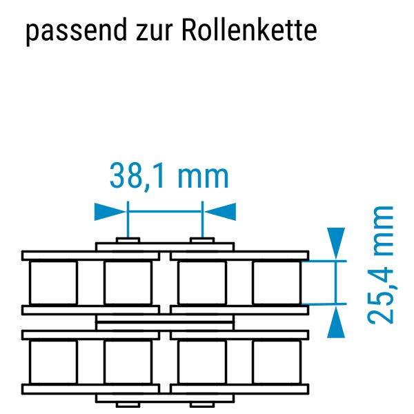 Mit 38,1 mm Teilung ist diese Baugröße für Schwerlastanwendungen ausgelegt. Sie wird z. B. im Bergbau, in der Schüttgutförderung oder in großen Antriebsanlagen eingesetzt, wo hohe Kräfte sicher übertragen werden müssen.