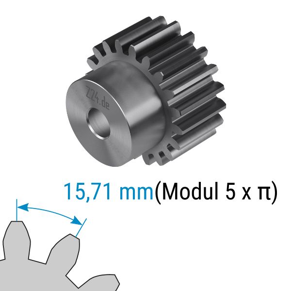 Zahnräder im Modul Modul 5 haben immer eine Teilung von 15,71 mm.