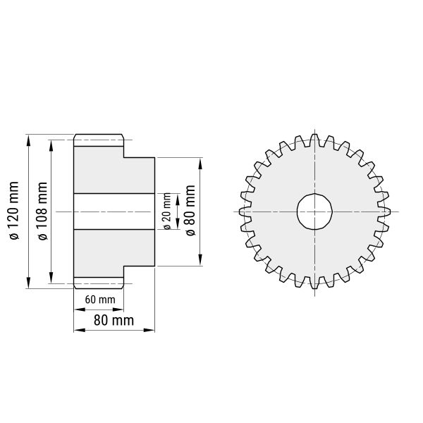 Bei Stirnzahnrädern mit bis zu 25 Zähnen ist beim Modul Modul 6 eine Nabe vorhanden.