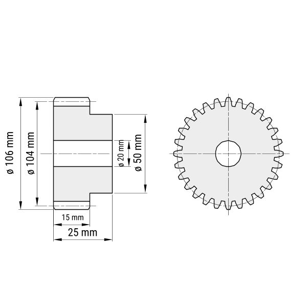 Modul 1 | Teilung: 3,14 mm | 104 Zähne | Durchmesser: 106 mm | mit Nabe | Kunststoff (PA6) | Vorbohrung: 20 mm (Achtung: Toleranz: 0,5 mm)