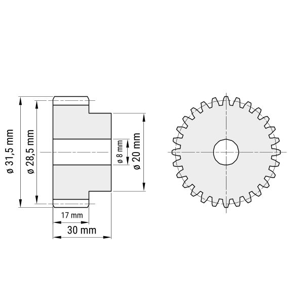 Modul 1,5 | Teilung: 4,71 mm | 19 Zähne | Durchmesser: 31,5 mm | mit Nabe | Kunststoff (PA6) | Vorbohrung: 8 mm (Achtung: Toleranz: 0,5 mm)