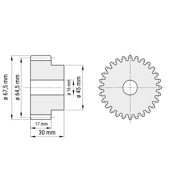 Modul 1,5 | Teilung: 4,71 mm | 43 Zähne | Durchmesser: 67,5 mm | mit Nabe | Kunststoff (PA6) | Vorbohrung: 16 mm (Achtung: Toleranz: 0,5 mm)