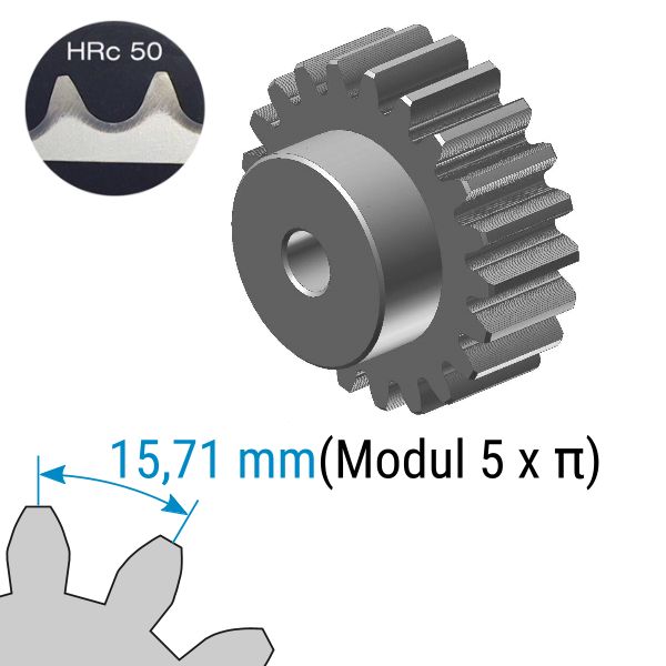 Modul 5 | Teilung: 15,71 mm | 12 Zähne | Durchmesser: 70 mm | mit Nabe | Stahl C45 | Zähne speziell gehärtet | Vorbohrung: 20 mm