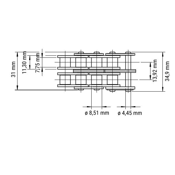 Teilung 12,7 mm von Bolzen zu Bolzen und Rollenbreite 7,75 mm.