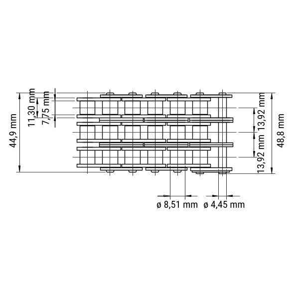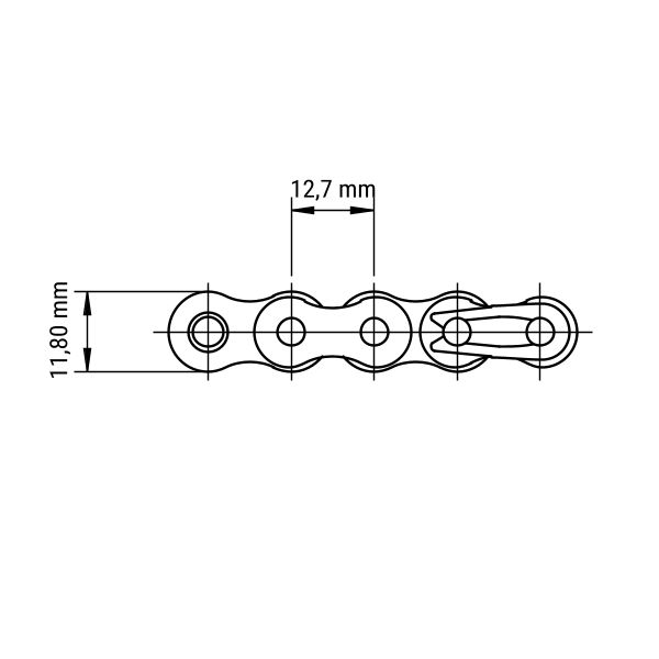 Teilung 12,7 mm von Bolzen zu Bolzen und Rollenbreite 7,75 mm.