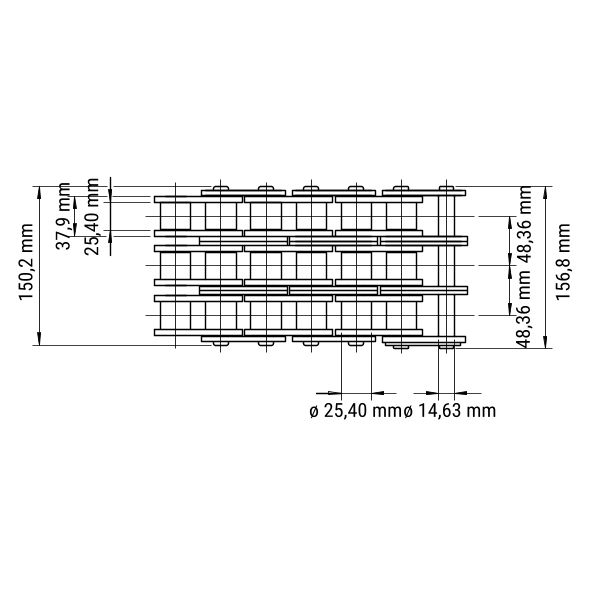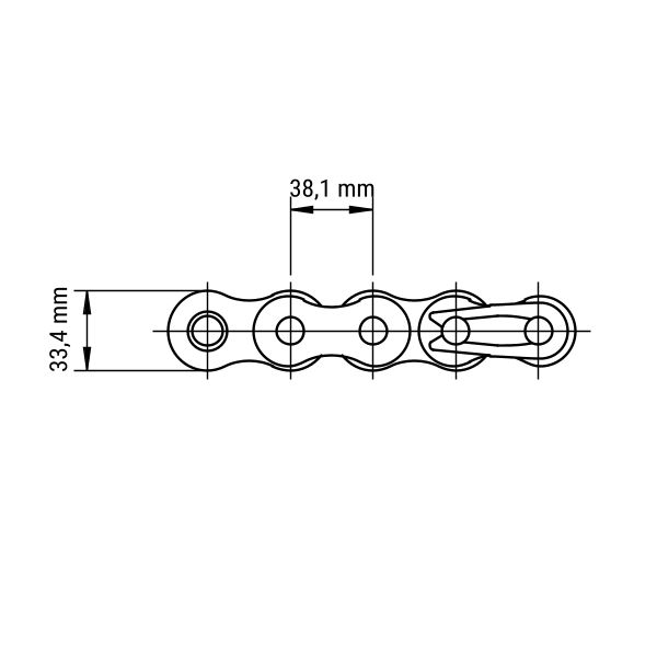 Teilung 38,1 mm von Bolzen zu Bolzen und Rollenbreite 25,4 mm.