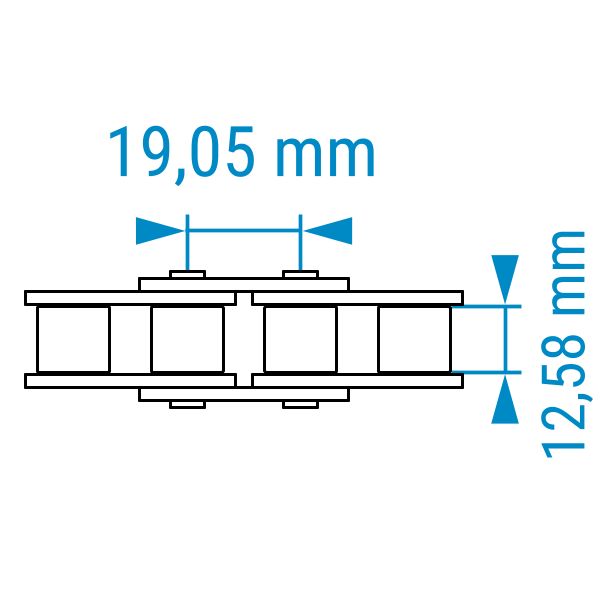 Teilung 19,05 mm von Bolzen zu Bolzen und Rollenbreite 12,58 mm.