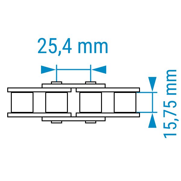Teilung 25,4 mm von Bolzen zu Bolzen und Rollenbreite 15,75 mm.