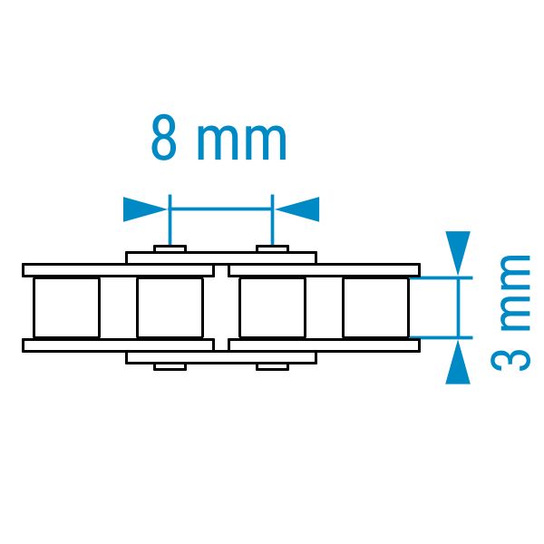 Teilung 8 mm von Bolzen zu Bolzen und Rollenbreite 3 mm.