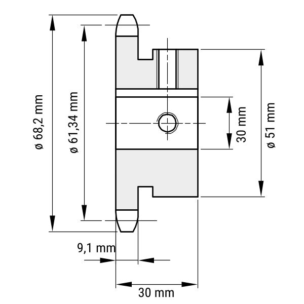 Kettenrad gehärtet 10B-1 / 12 Zähne - Bohrung 30 mm, Nut und zwei Gewindebohrungen