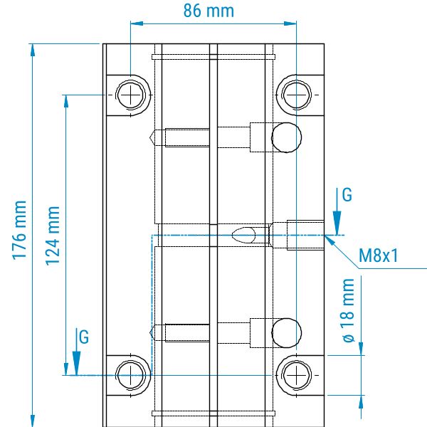 mit 4 Bohrungen zur Befestigung der Anschlusskonstruktion. Diese Variante wird meist benötigt, wenn vorher ein INA-Gehäuse montiert war.