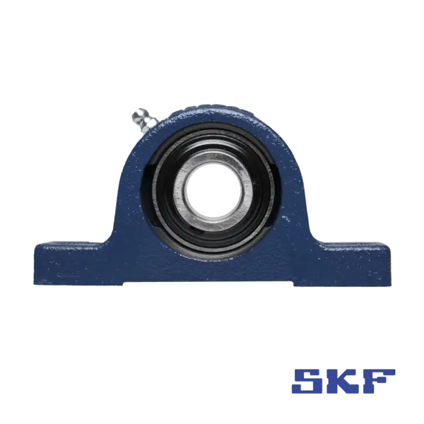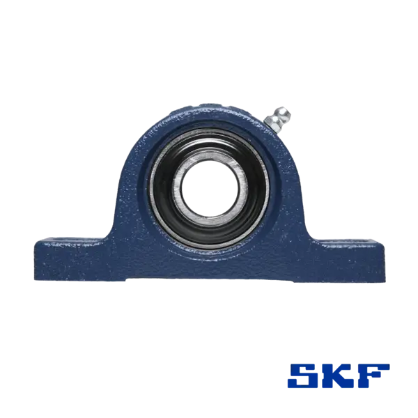 SKF SY-Stehlagereinheit mit langem Fuß für stabile Befestigung. Geeignet für fest verschraubte Montagen mit hoher Standfestigkeit.