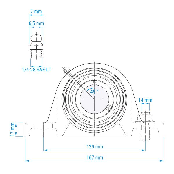 SKF SYJ-Stehlagereinheit nach japanischer JIS-Norm in robuster Ausführung mit langem Fuß. Geeignet für stabile festverschraubte Montagen.