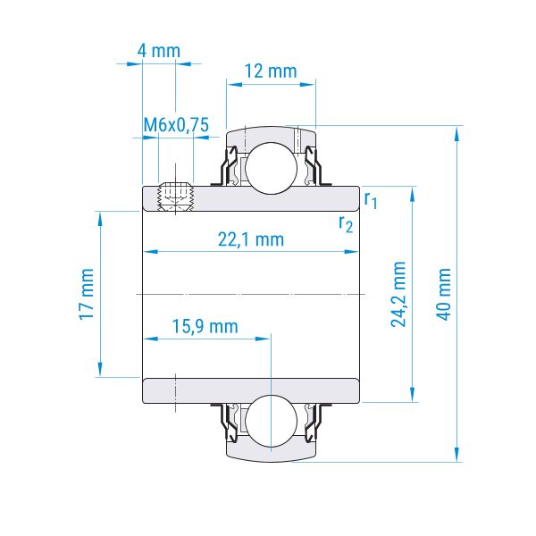 ø Welle: 17 mm | ø Außen: 40 mm | Breite: 22,1 mm | einseitig verbreiterter Innenring | Wellenbefestigung mit Stellschrauben | Lager aus Wälzlagerstahl
