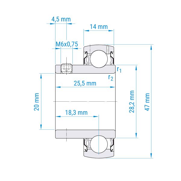 ø Welle: 20 mm | ø Außen: 47 mm | Breite: 25,5 mm | einseitig verbreiterter Innenring | Wellenbefestigung mit Stellschrauben | Lager aus Wälzlagerstahl