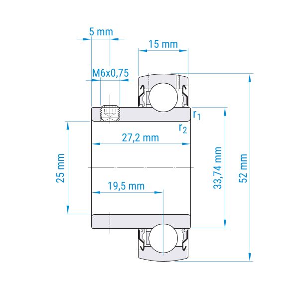 ø Welle: 25 mm | ø Außen: 52 mm | Breite: 27,2 mm | einseitig verbreiterter Innenring | Wellenbefestigung mit Stellschrauben | Lager aus Wälzlagerstahl