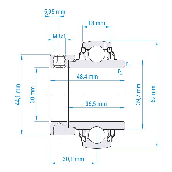 ø Welle: 30 mm | ø Außen: 62 mm | Breite: 48,4 mm | beidseitig verbeiterter Innenring | Wellenbefestigung mit Exzenterring | Lager aus Wälzlagerstahl