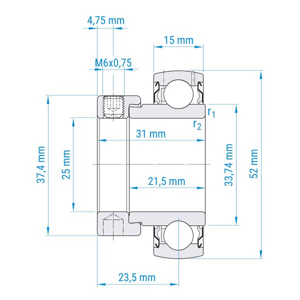 ø Welle: 25 mm | ø Außen: 52 mm | Breite: 31 mm | einseitig verbreiterter Innenring | Wellenbefestigung mit Exzenterring | Lager aus Wälzlagerstahl