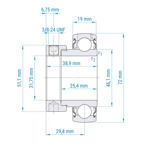 ø Welle: 31,75 mm | ø Außen: 72 mm | Breite: 38,9 mm | einseitig verbreiterter Innenring | Wellenbefestigung mit Exzenterring | Lager aus Wälzlagerstahl