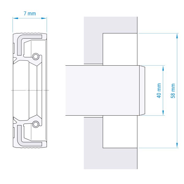 ø Innen: 40 mm | ø Außen: 58 mm | Breite: 7 mm | Bauform: HMSA10 (mit Schutzlippe) | Material: NBR