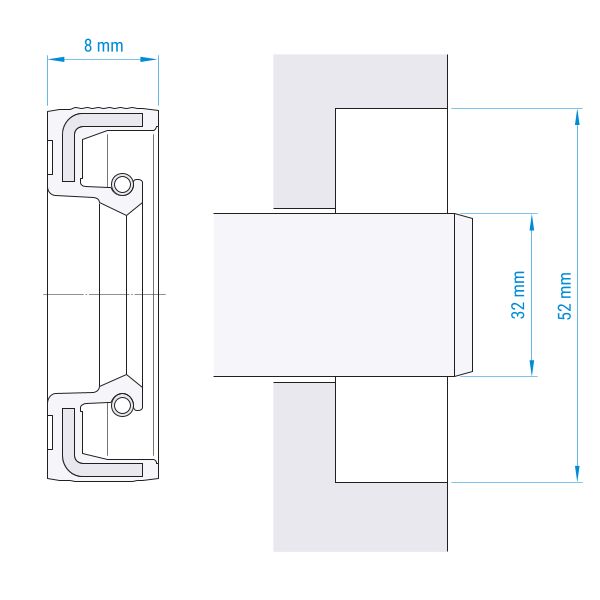 ø Innen: 32 mm | ø Außen: 52 mm | Breite: 8 mm | Bauform: HMS5 (ohne Schutzlippe) | Material: FKM